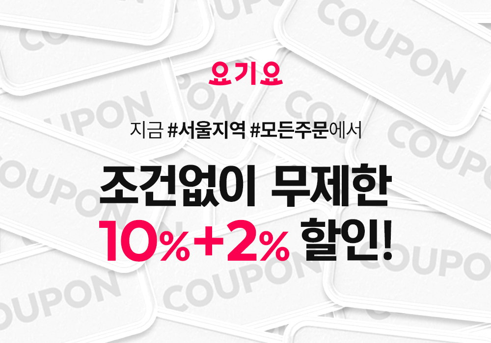 ■ 5월 간 서울 지역 모든 음식 배달 주문 시 조건없이 무제한 사용 가능한 총 12% 할인 쿠폰